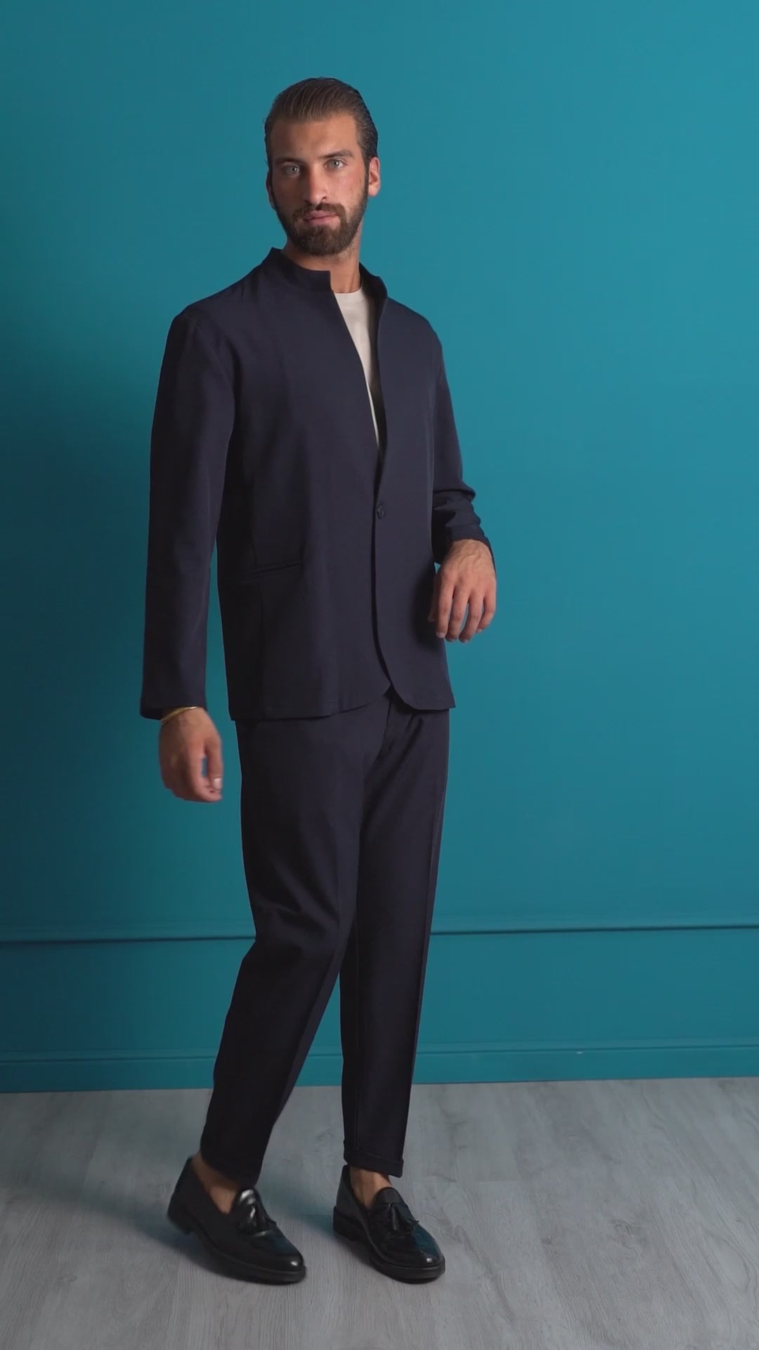 Abito uomo in tinta unita dal taglio moderno e minimalista. La giacca monopetto con chiusura a un bottone si distingue per il collo alla coreana, che dona un tocco contemporaneo e ricercato al capo. Il design pulito è arricchito da tasche laterali a filetto e da una linea essenziale che valorizza la silhouette. I pantaloni coordinati presentano vestibilità regolare, tasche laterali oblique e fondo con risvolto, per un look versatile ed elegante. Perfetto per chi cerca uno stile formale ma allo stesso tempo attuale e raffinato.