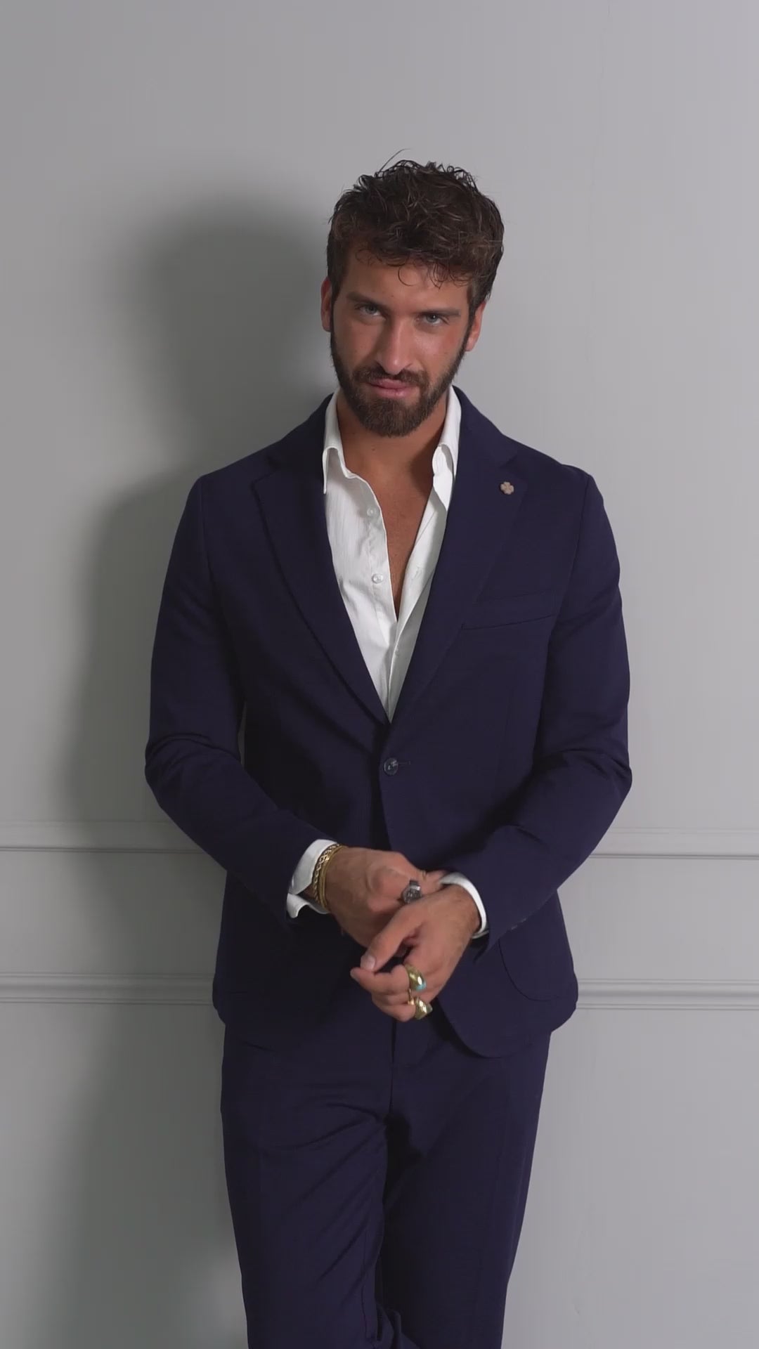 Abito sartoriale dal fascino intramontabile. La giacca, dal taglio strutturato e dalle linee precise, presenta revers classici e tasche a toppa anteriori, segno distintivo di stile. La chiusura a due bottoni mantiene un’eleganza formale, mentre il tessuto di qualità assicura comfort e vestibilità impeccabile. Il pantalone coordinato, slim fit con risvolto sul fondo, completa un insieme che unisce tradizione sartoriale e carattere deciso, perfetto per cerimonie, eventi e contesti in cui distinguersi è essenziale.