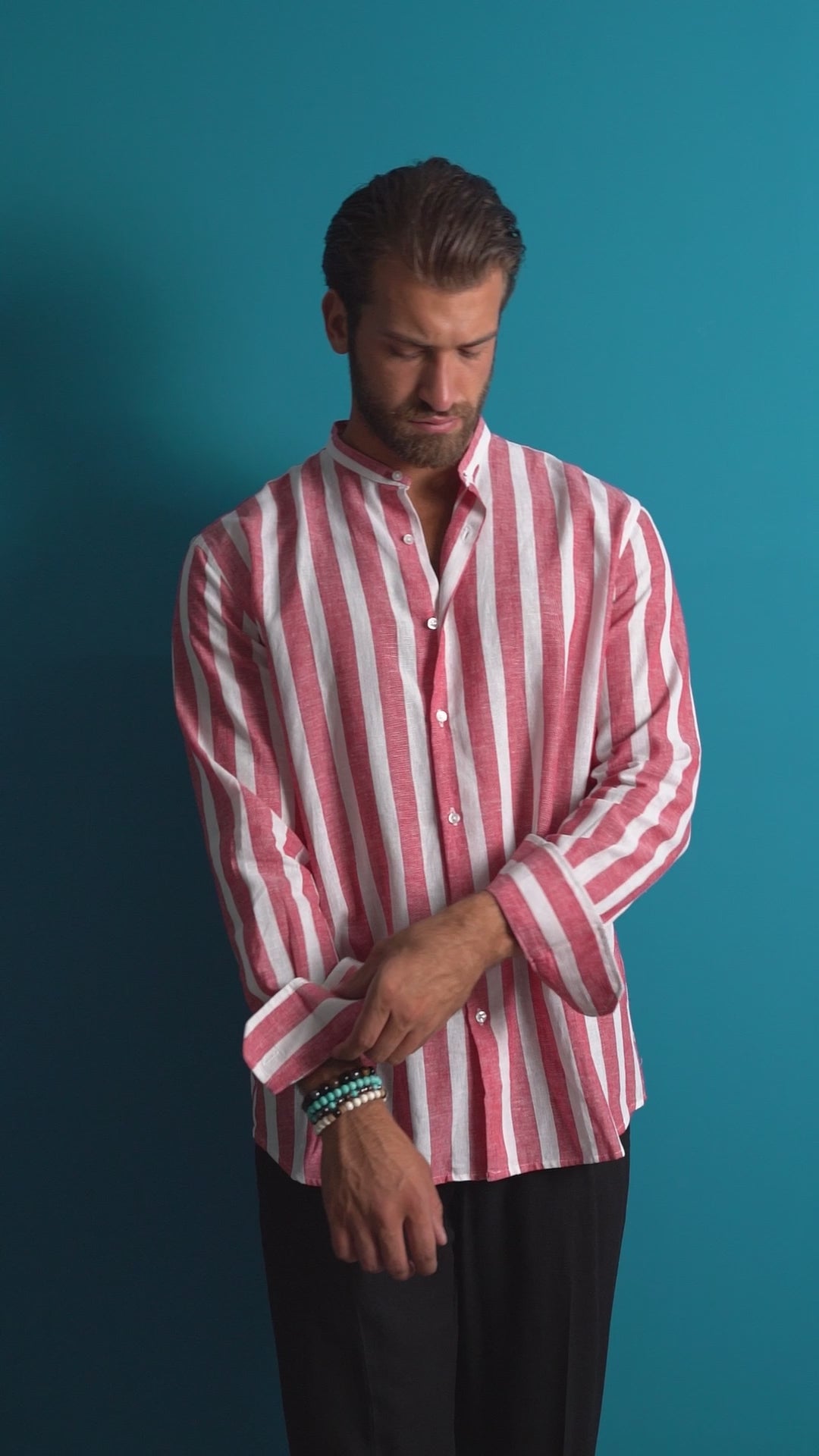 Freschezza naturale e stile disinvolto definiscono questa camicia in lino, pensata per chi ama distinguersi con eleganza anche nei momenti più informali. Il collo coreano aggiunge un tocco contemporaneo e minimale, mentre le righe larghe donano dinamismo e personalità al look. Le maniche lunghe la rendono perfetta per le serate estive o per essere indossata con le maniche arrotolate in modo più casual. Ideale da abbinare a pantaloni in lino o denim, per uno stile estivo e rilassato.