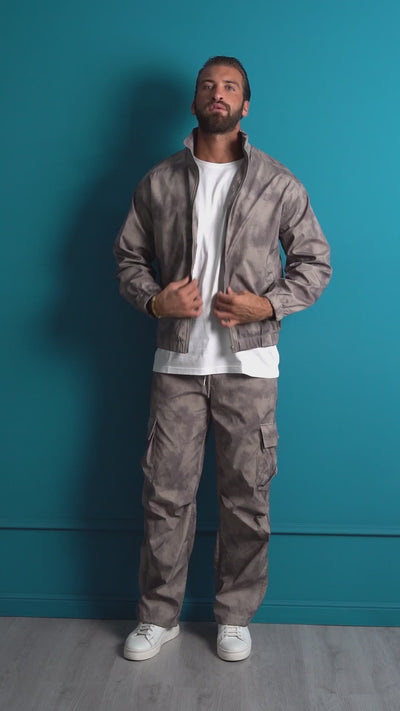 Outfit dallo stile over e contemporaneo, composto da giubbotto bomber con tasche a filo frontali ed elastico sul fondo per un fit rilassato ma definito. Il look si completa con pantaloni cargo con elastico in vita e tasche laterali. La fantasia è sfumata tie dye a due tonalità che dona un tocco unico e urbano.