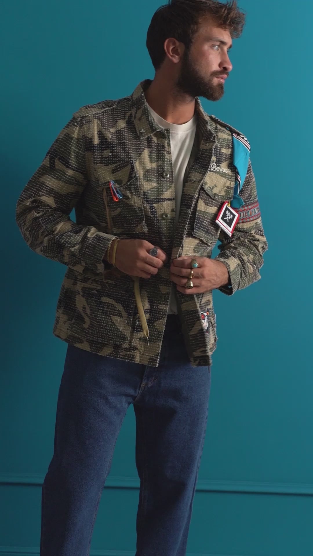 Giacca camouflage texturizzata con patch e ricami che donano un tocco urban e originale. Realizzata in tessuto strutturato, presenta colletto, chiusura full zip frontale e tasche applicate con patta. Le spalline con bottone, le decorazioni a contrasto e l’applicazione sul retro esaltano il carattere deciso del capo. Un modello grintoso e di tendenza, perfetto per completare outfit casual e streetwear.