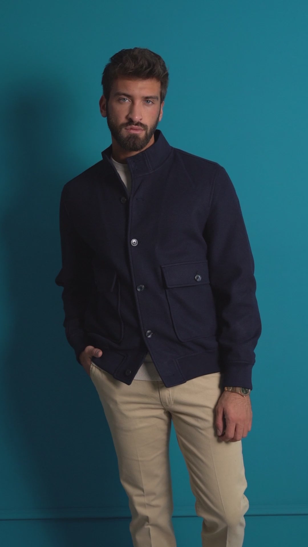 Giubbotto bomber in panno tinta unita, pensato per offrire comfort e stile in un’unica soluzione. La chiusura frontale con bottoni dona un tocco più strutturato rispetto alla classica zip, mentre il collo alto elasticizzato assicura protezione e una vestibilità avvolgente, in linea con il carattere sportivo del modello. Completano il design i polsini e il fondo giubbotto elasticizzati, che garantiscono aderenza e mantengono la forma del capo. Le tasche a busta con bottone aggiungono praticità e un’estetica pulita, perfettamente in armonia con lo stile essenziale del bomber. Un giubbotto versatile e contemporaneo, ideale per look casual e quotidiani con un tocco di carattere.