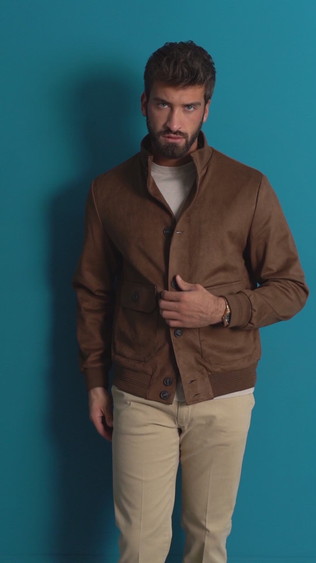 Giubbotto uomo dallo stile pulito ed elegante, realizzato in un morbido tessuto effetto suede che dona al capo un look sofisticato e allo stesso tempo moderno. La tonalità lo rende estremamente versatile e facile da abbinare, ideale per creare outfit raffinati in ogni occasione. La chiusura frontale con bottoni crea un piacevole contrasto cromatico, mentre le tasche frontali con patta aggiungono funzionalità e carattere. Il colletto alto può essere indossato sia aperto che completamente chiuso, offrendo protezione nelle giornate più fresche e un tocco di stile in più. I polsini e il fondo elasticizzati assicurano una vestibilità comoda e aderente, valorizzando la silhouette senza rinunciare al comfort. Perfetto da indossare su camicie, maglie o dolcevita, questo giubbotto è la scelta ideale per chi cerca un capo ricco di personalità, adatto alla stagione autunno/inverno.